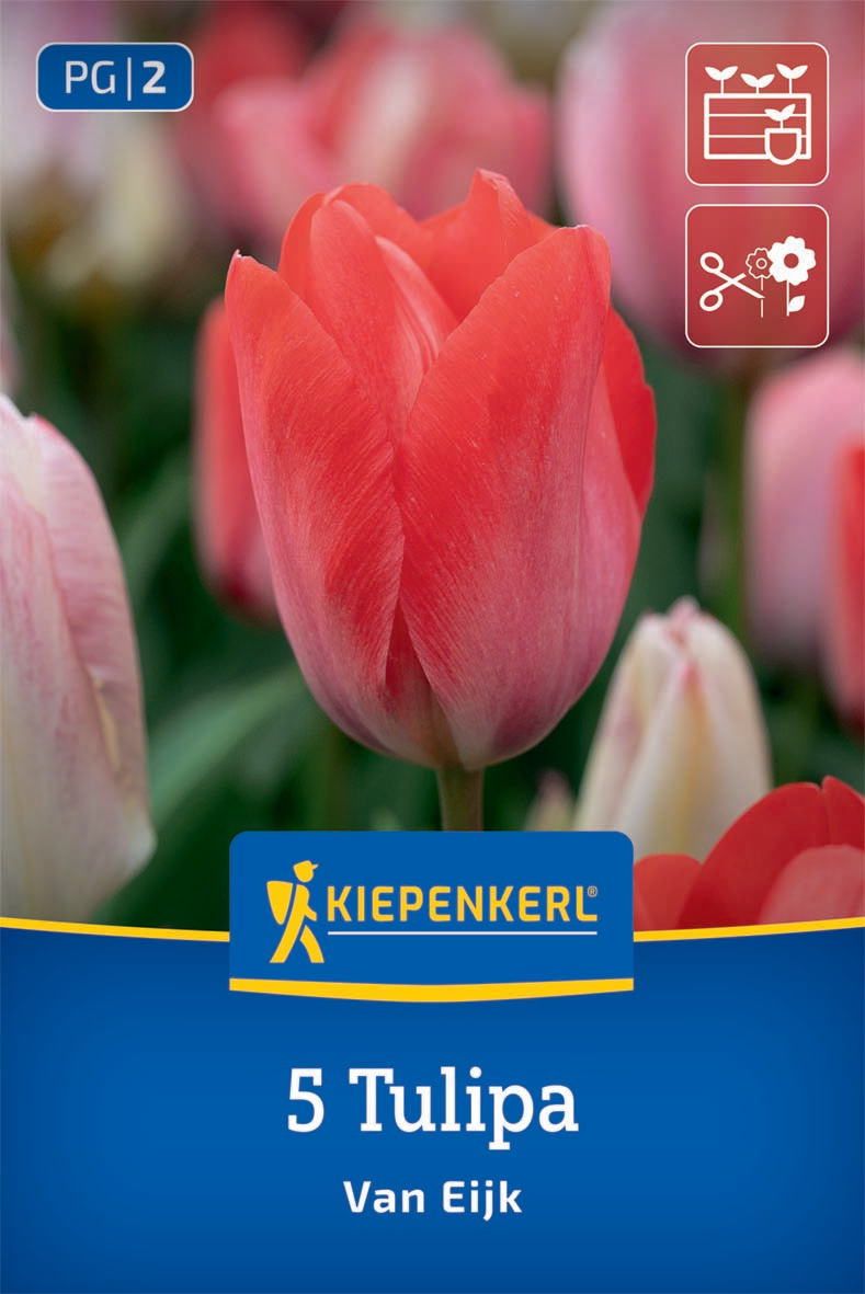 Die weltweit bekannte Tulpensorte 'Van Eijk' besticht durch ihre eleganten Blüten in einem zarten Rosa- und Weißton. Zurückhaltend und zugleich extravagant schimmern die großen Blüten aus jedem Frühlingsbeet hervor, insbesondere dann, wenn sie in Gruppen gepflanzt wurden. Mit einer starken, aufrechten Wuchsform und einer Höhe von etwa 40-50 Zentimetern eignet sich die Darwin-Tulpe 'Van Eijk' ideal für Beete, Pflanzkombinationen mit Narzissen oder im Kübel. Die Blütenfarbe und der Blütezeitpunkt macht die Tulpe 'Van Eijk' zu einem unverzichtbaren Highlight im Frühlingsgarten.