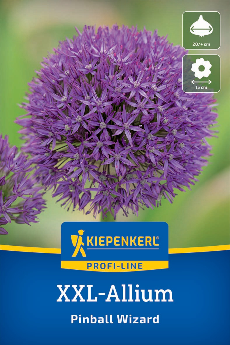 Der Zierlauch `Pinball Wizard` von Kiepenkerl gehört zu den eindrucksvollsten Riesen-Zierlauchen im Garten. Die XXL-Blumenzwiebel sorgt für kräftiges Wachstum und besonders große Blütenkugeln in intensivem Lila. Jede Kugel besteht aus vielen sternförmigen Einzelblüten, die einen Durchmesser von bis zu 15 Zentimetern erreichen und Bienen und anderen Insekten wertvolle Nahrung bieten. Mit einer Wuchshöhe von etwa 80 Zentimetern schwebt Pinball Wizard eindrucksvoll über Staudenbeeten und Etagenpflanzungen.